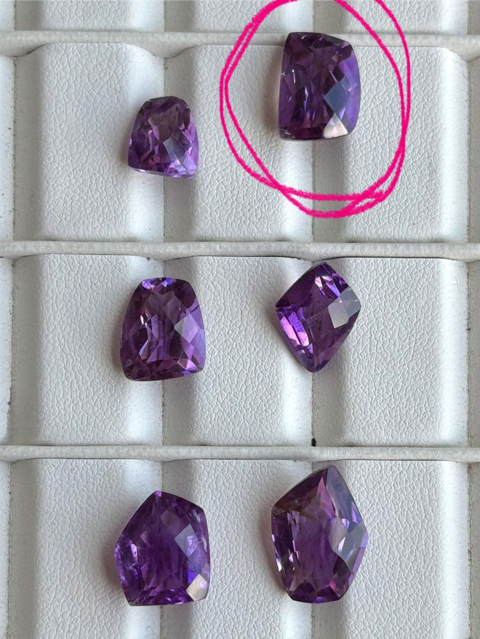 ハンドメイド作家さんや石好きさんたちに是非オススメしたい、透き通った紫色が魅力的で可愛いファンシーチェッカーボードカット天然アメジスト(紫水晶)の裸石です。